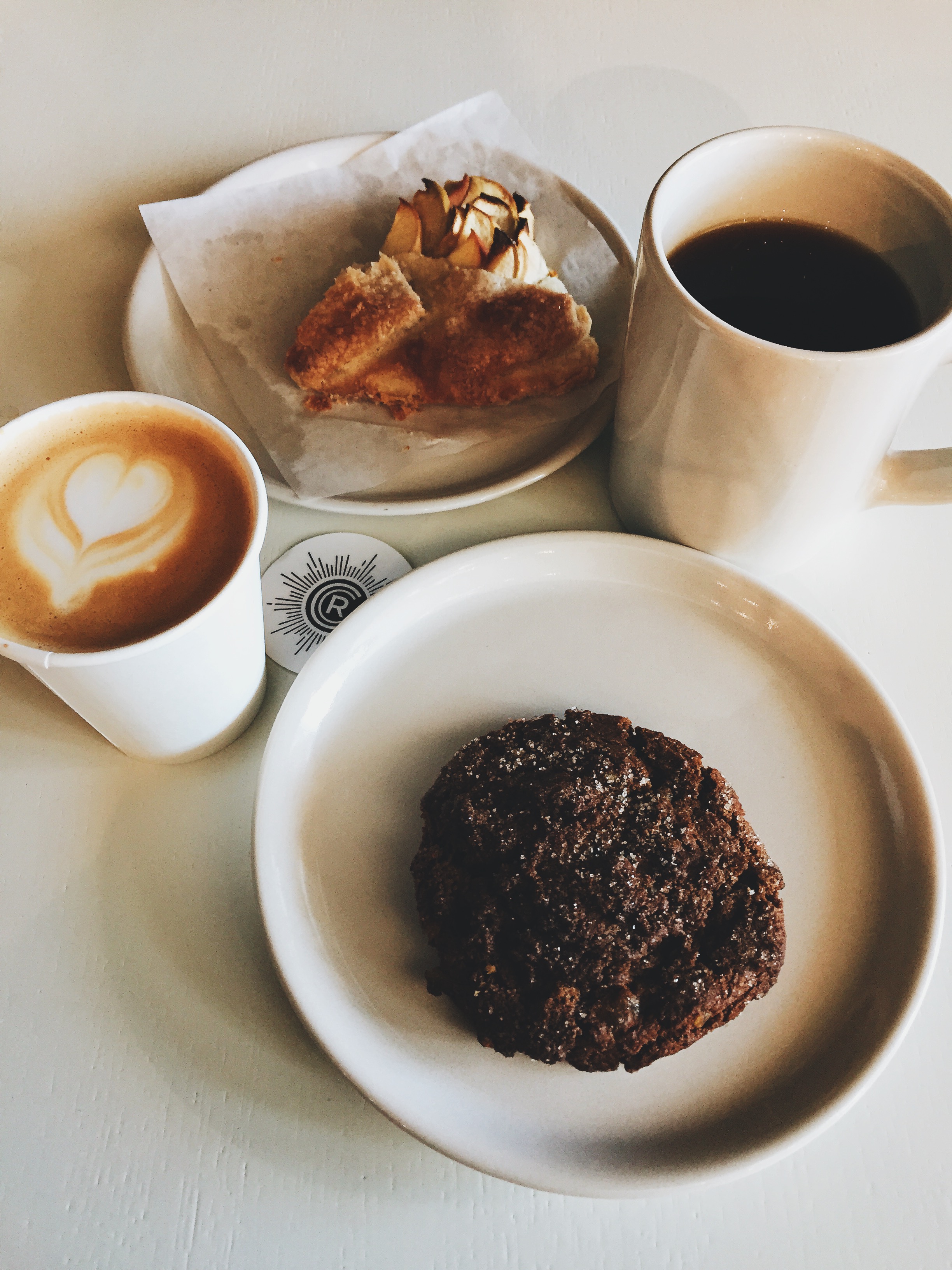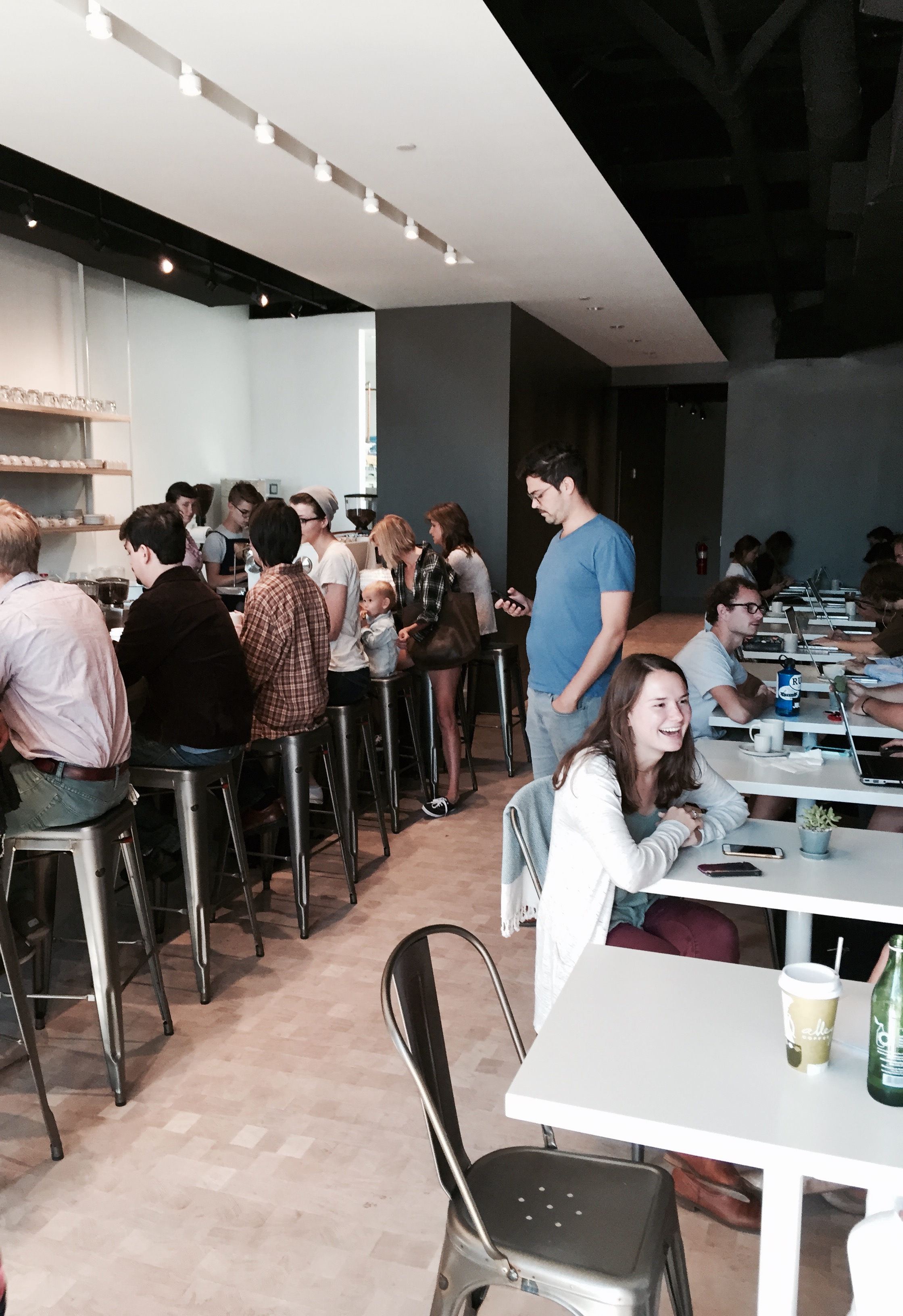 Revelator was a tiny spot with a minimalistic, yet modern vibe.  The baristas were all very friendly and made great recommendations.  I had the opportunity to try a small latte and an Ethiopian blend coffee. I first tried the coffee which I enjoyed very much.  I am usually not a huge fan of Ethiopian blends, but once I took a sip of this coffee I decided that I should officially change my mind.  Although I was a bit skeptical because this was a coffee they had on tap, there was no bitterness at all and it seemed as if it had been brewed right when I ordered it.  I then took a few sips of my friends latte.  The crema was not too strong like it can be in some lattes, but you could still taste that espresso flavor.  There was not much foam, which I am a fan of, making it have a smooth and creamy texture throughout.  All in all, I was very impressed by this coffee shop and look forward to returning, hopefully when crowds are less hectic.